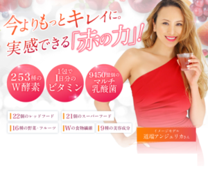 | ぜいたくレッドスムージーの特徴は9450億個のマルチ乳酸菌、1包で1日分のビタミン、253種のW酵素があり、22個のレッドフードと21個のスーパーフードと16種の野菜・フルーツとWの食物繊維と9種の美容成分が含まれているスーパードリンクです。 しかもこの商品のイメージモデルを美容で人気のある道端アンジェリカさんがやっているのです。 |