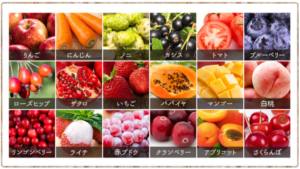 レッドビート、フランボワーズ、ドラゴンフルーツ、アセロラ、りんご、にんじん、ノニ、カシス、トマト、ブルーベリー、ローズヒップ、ザクロ、いちご、パパイヤ、マンゴー、白桃、リンゴベリー、ライチ、赤ブドウ、クランベリー、アプリコット、さくらんぼ